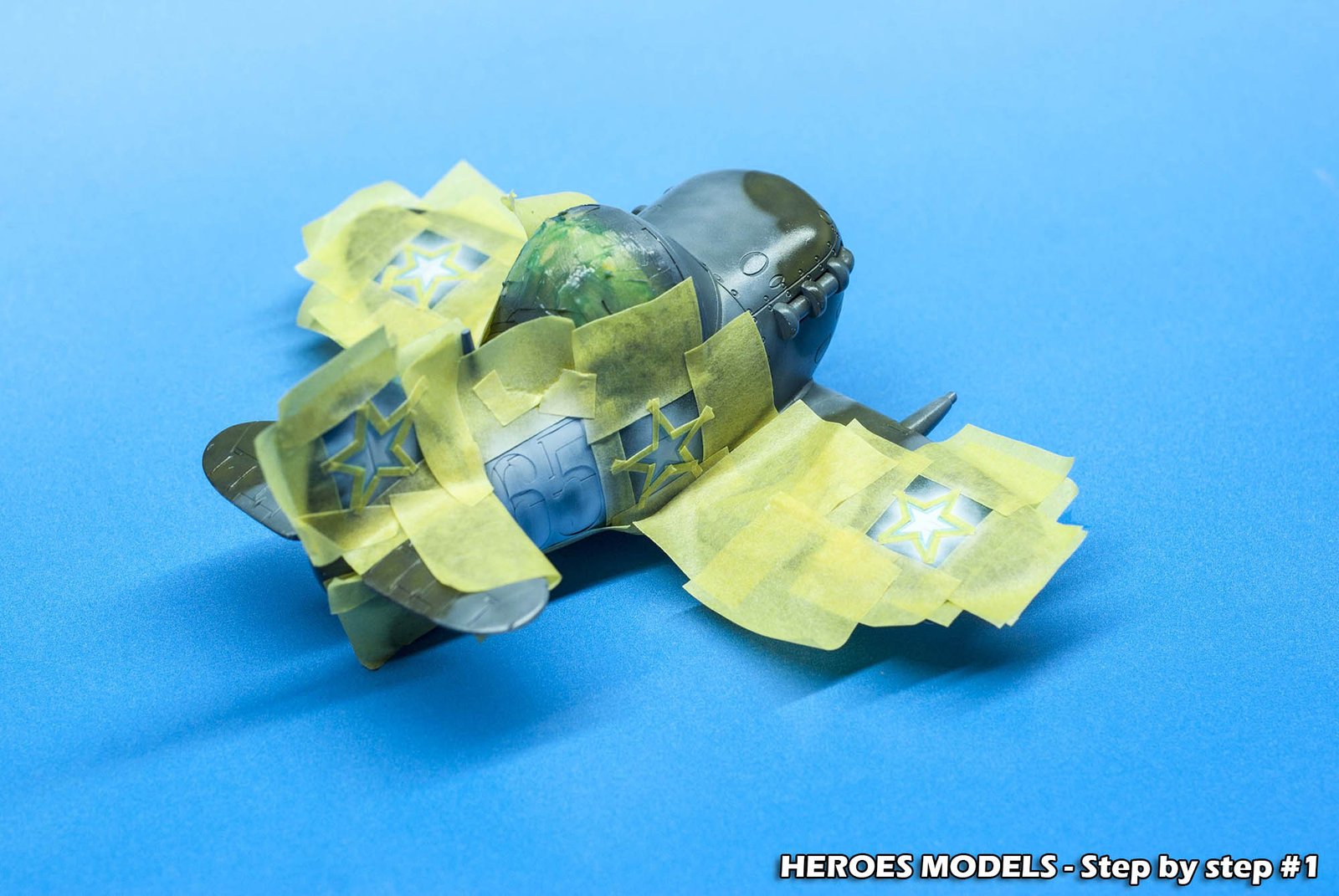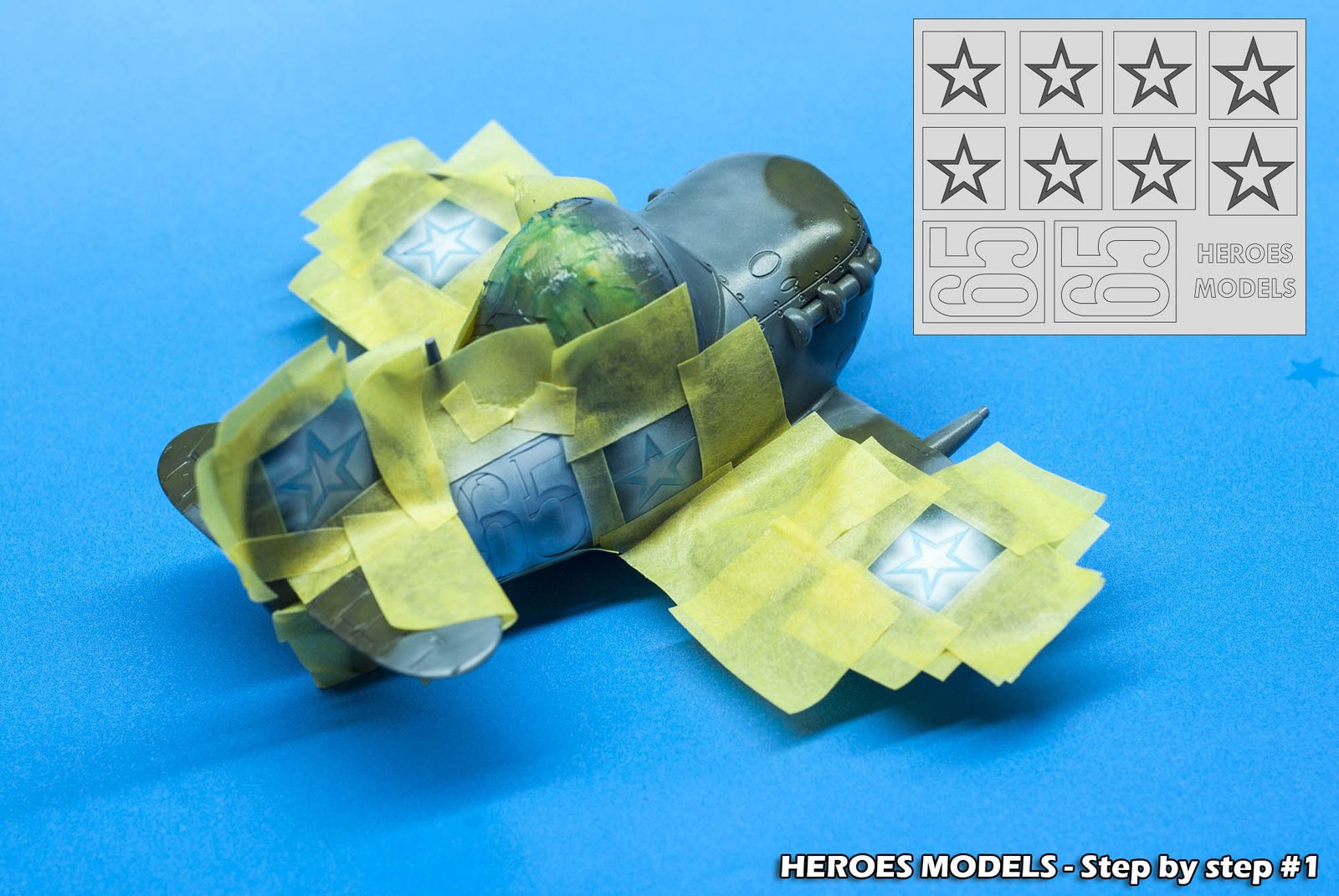 The next step was painting the insignia with masks. These were custom masks that I designed for this models, if you need the same masks contact us, if you need something different we can customize masks or decal. We started to position the masks needed for the white color, two 65 and the stars.