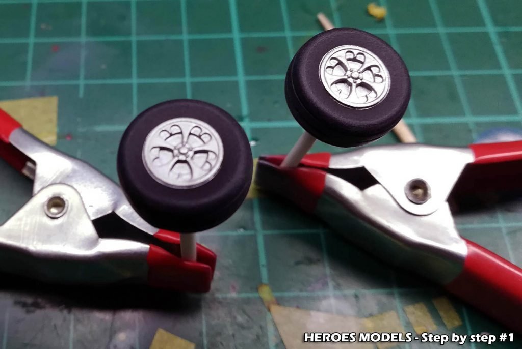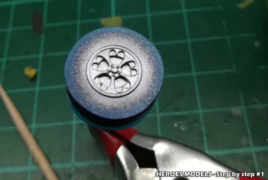 We masked the exhausts and sprayed with flat black. When dried we made a dry-brush with some shades of browns. We used the same black on the resin wheels and used the masks included to color with aluminium.