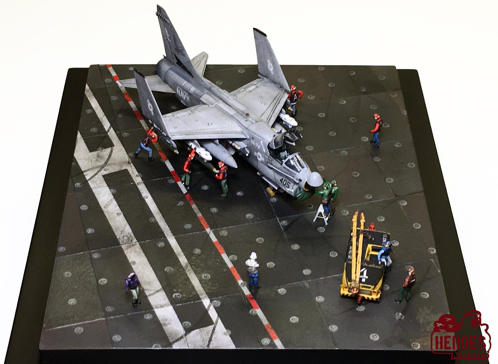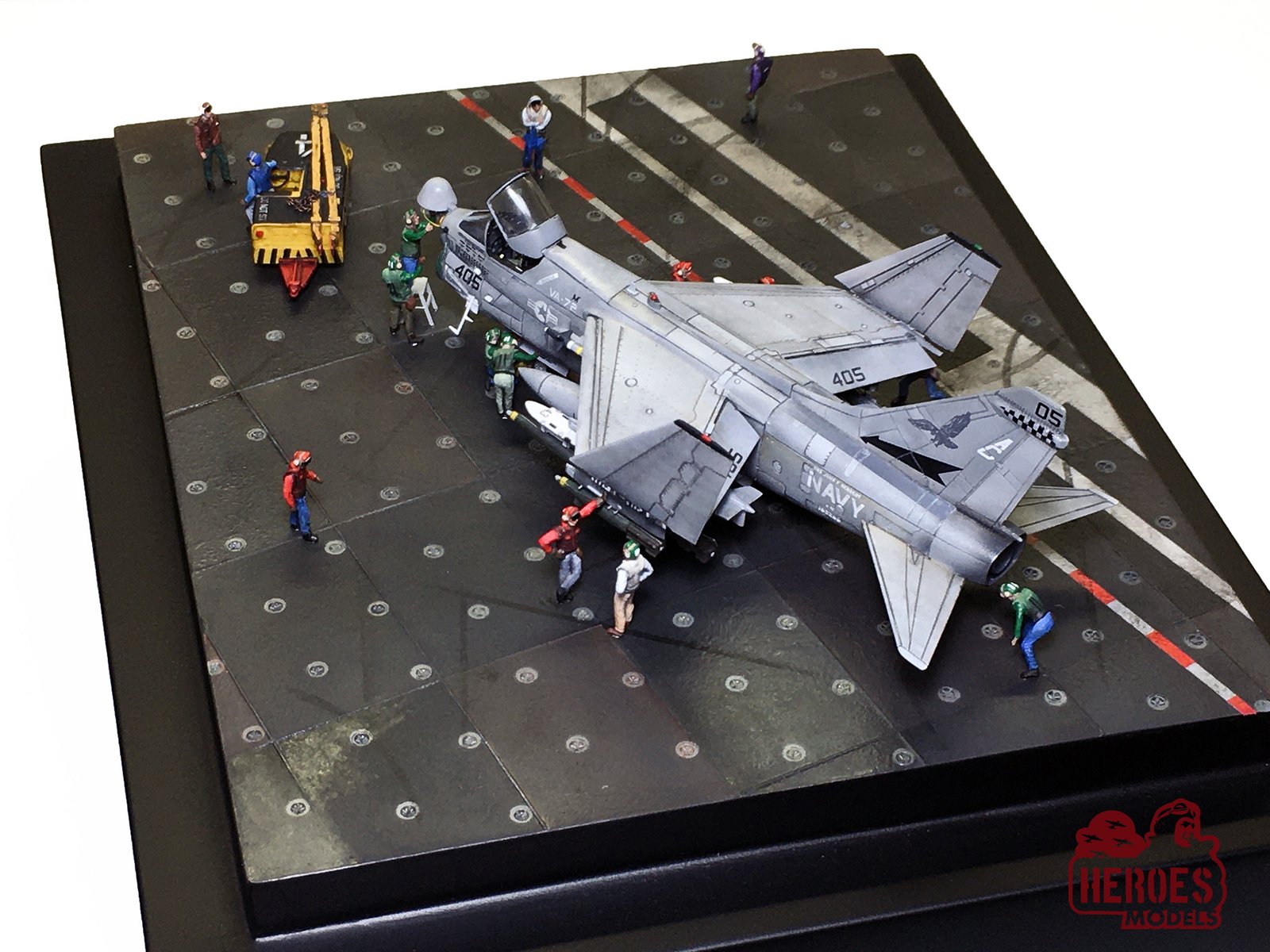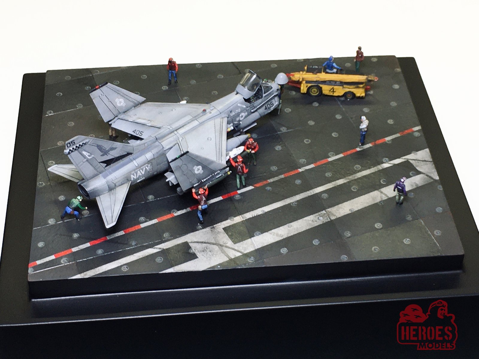 An A-7E Corsair, in one of the last operational missions of this plane, is being prepared to start a bombing mission. All the elements in the diorama convey the feeling of the activity on the carrier deck, someone works, someone talks, someone is getting bored.